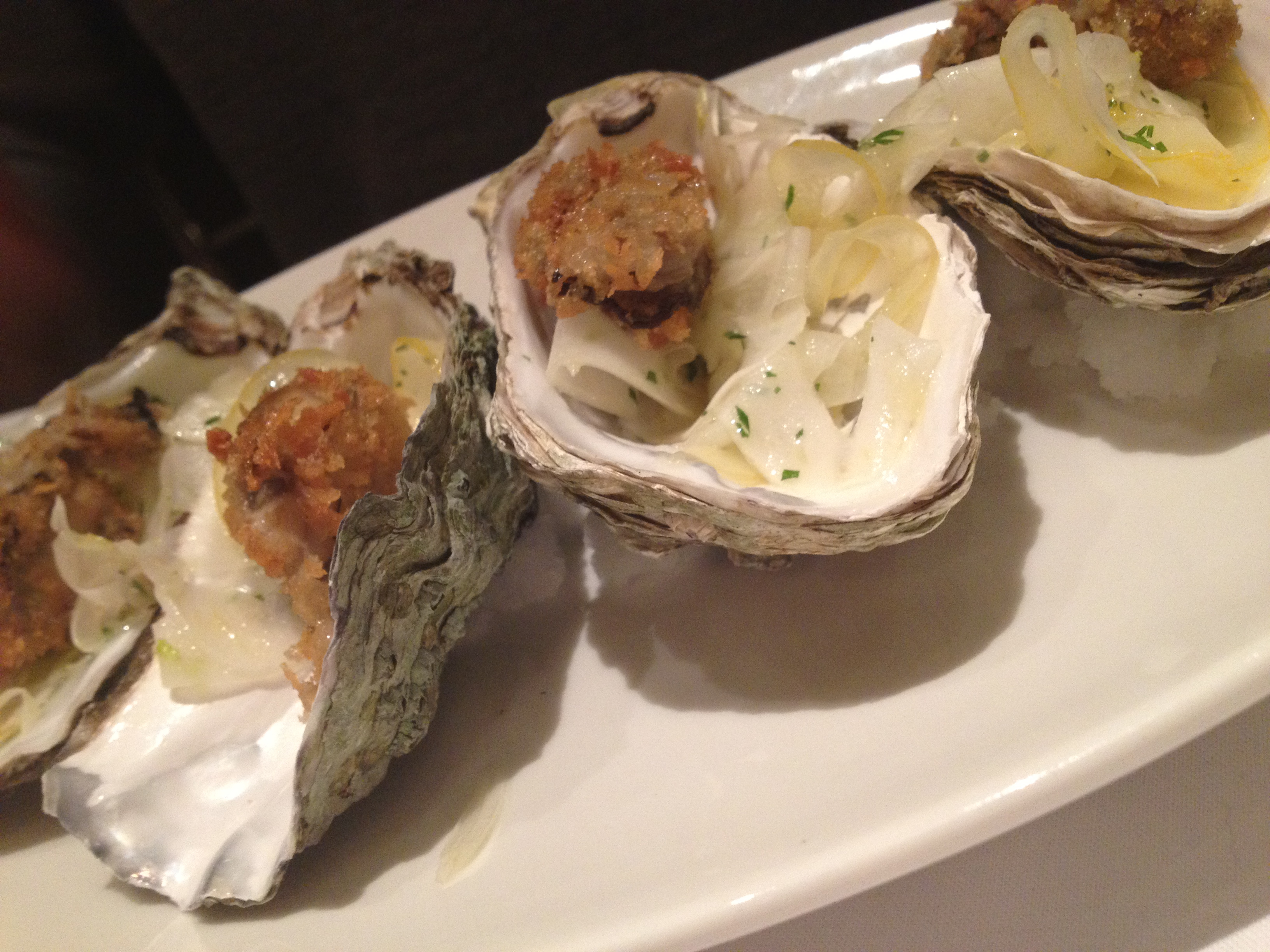 Najpierw zupy i przystawki – świetne smażone ostrygi, podane na lekko kwaśnym confit z cebuli. Bardzo dobre i cieszące oko.