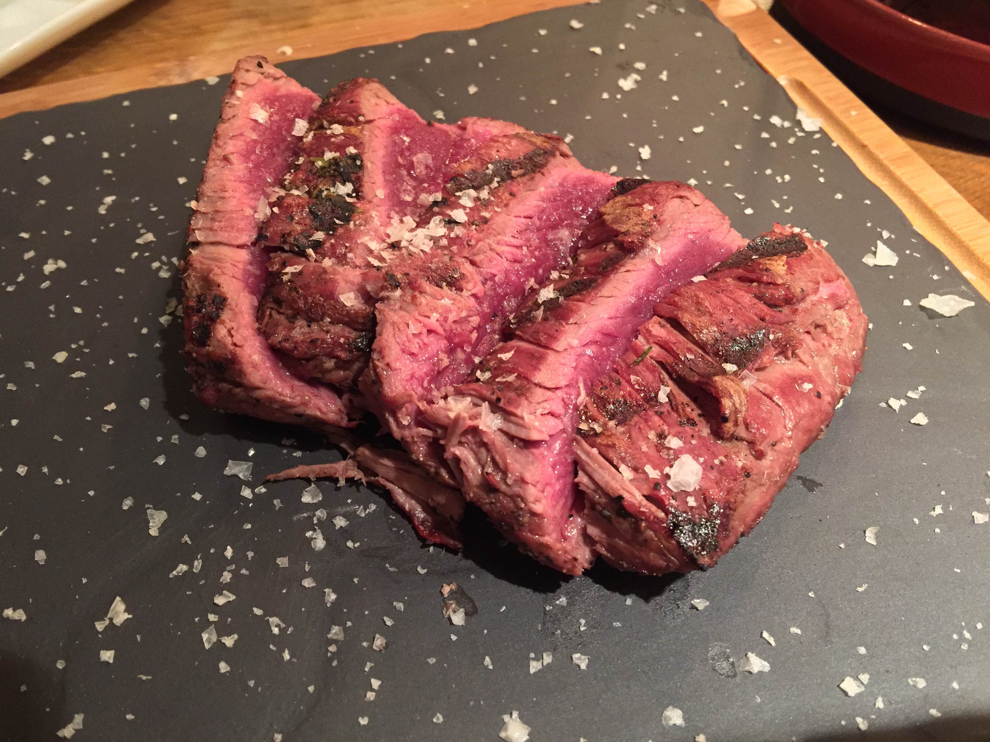 Oczywistym jest, że decyduję się na stek z emu (72 zł). Kelnerka rekomenduje by był medium, bo to mięso nie lubi zbyt długiej obróbki. Pokażcie mi stek, który lubi. Nie mam z tym problemu, więc mówię, że jak dla mnie może być nawet upiornie krwisty. Mięso ma dość luźną strukturę, zupełnie inną od sezonowanej wołowiny. Jest też rozkosznie różowe, delikatne, lekko dymne i pełne smaku. Stek z emu polecam serdecznie. Do niego dobieram jeszcze pieczonego ziemniaka ze sporą ilością masła i szczypiorku (10 zł). Mam jakąś wieczną tęsknotę za takimi prostymi smakami i przyznam, że ten nie zawodzi.