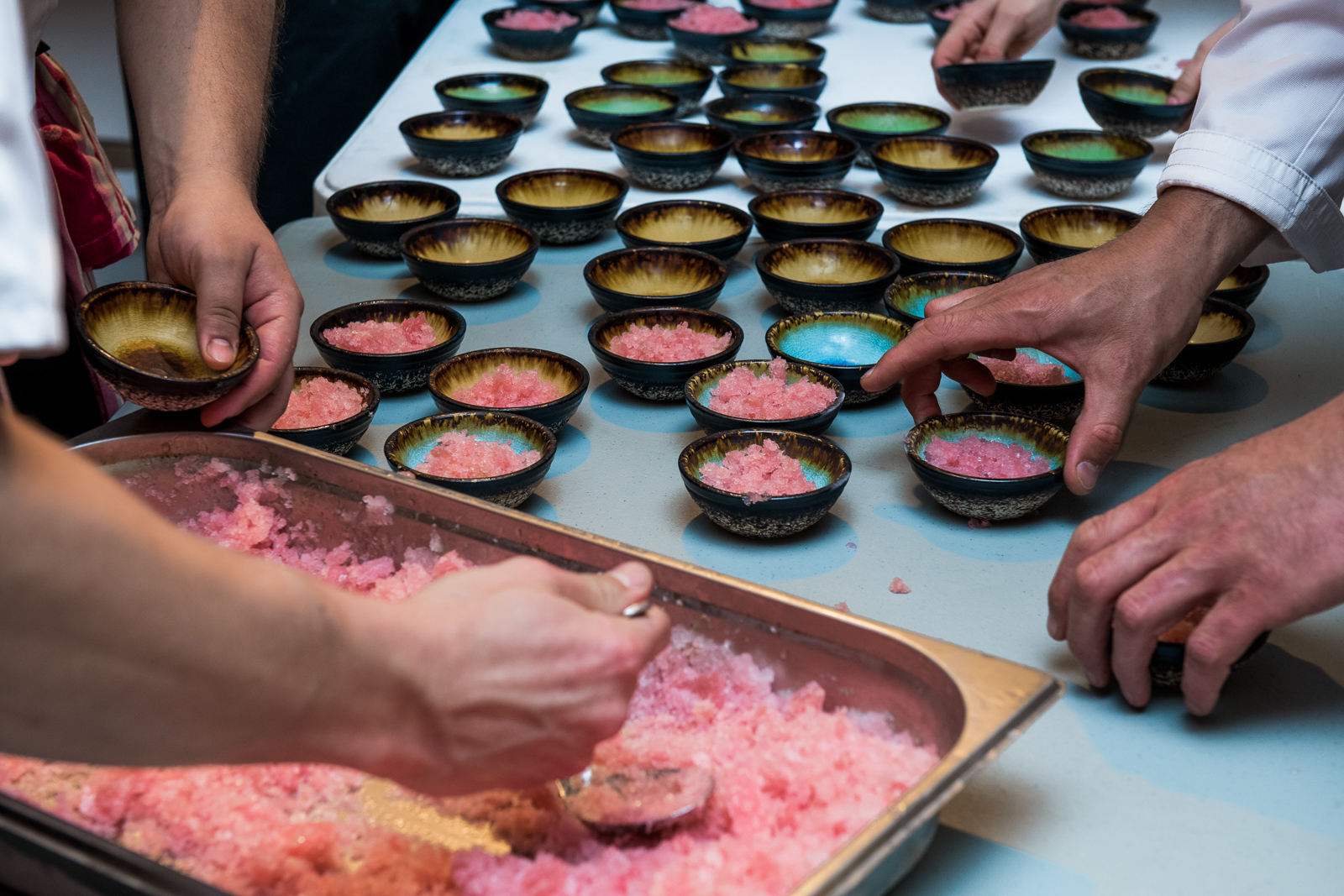Równie znakomity, delikatny, rozpadający się na włókna był szponder wołowy duszony w winie, ale najwięcej atrakcji dostarczył nam deser, który smakował różnie w zależności od tego jakie było światło i jaka muzyka grała w tle. I tak oto ten sam deser najpierw był niemal wytrawny, by po chwili smakować mocno słodko. Kurczę, jakie to wszystko było dobre! Wszystko w sensie jedzenia, atmosfery, pomysłu, organizacji. Do tego perfekcyjny serwis, co zawsze jest trudne przy dużej liczbie gości i serwowaniu dań synchronicznie, a z drugiej strony fenomenalna atmosfera i kompletny brak zadęcia mimo, że to wydarzenie z kategorii eleganckich. Mam wrażenie, że wszyscy się naprawdę dobrze bawili. W każdym razie ja wróciłam do domu szczerze zachwycona nie tylko tym wieczorem, ale i faktem, że mogę w takich wydarzeniach uczestniczyć.