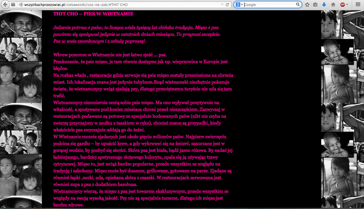 Co ciekawe, ten sam post na wallu autorki nie wzbudził prawie żadnego zainteresowania, więc po jakimś czasie go odświeżyła. Ponownie odzew był raczej nikły. A przecież tak się zaangażowała, poświęciła aż dwa dni na znalezienie miejsca, w którym skosztuje psiego mięsa. Ostatecznie jej nie smakowało i całą sytuację opisała dość beznamiętnie. Ponieważ vege-people zrobili jej wjazd na fejsa, post finalnie zniknął również jej walla. Zrzuty ekranu z bloga tu i tu.