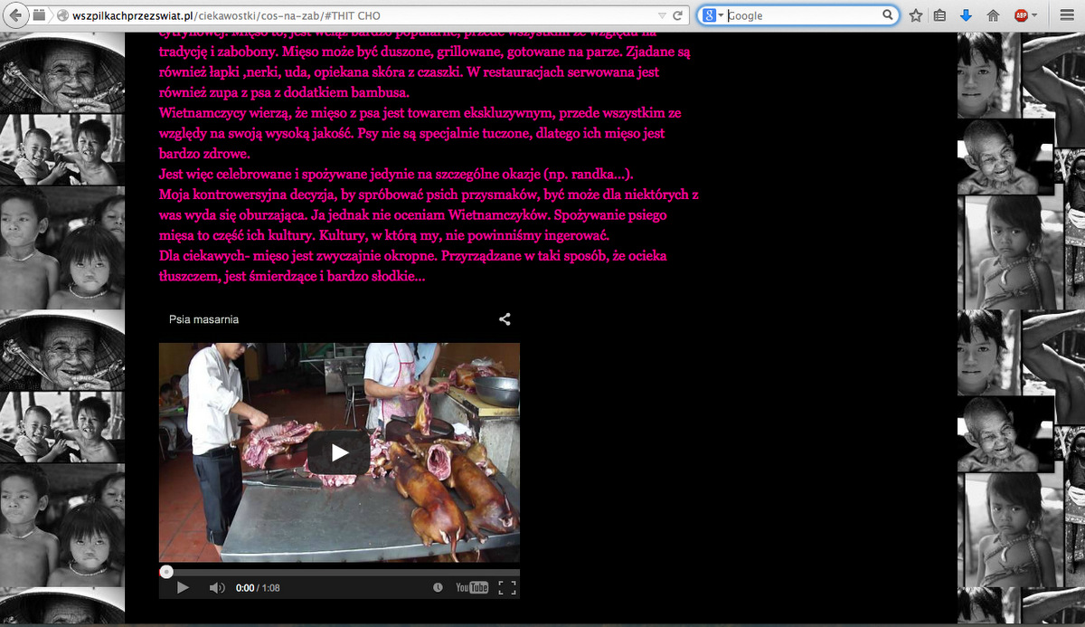 Zastanawiam się też gdzie są granice wolności? Czy ocenianie tej dziewczyny jest już ich przekroczeniem? Powiecie, że sama wystawia się na publiczny pręgierz. To prawda. Z drugiej strony zrobiła coś, co w tamtym kręgu kulturowym nie jest żadnym wynaturzeniem. Nie zabiła psa sąsiada i nie nadziała go na rożen w tym tu Działdowie czy innym Sosnowcu, aby zaspokoić swoją chorą ciekawość. Pojechała do Wietnamu i zjadła to, co jedzą Wietnamczycy.